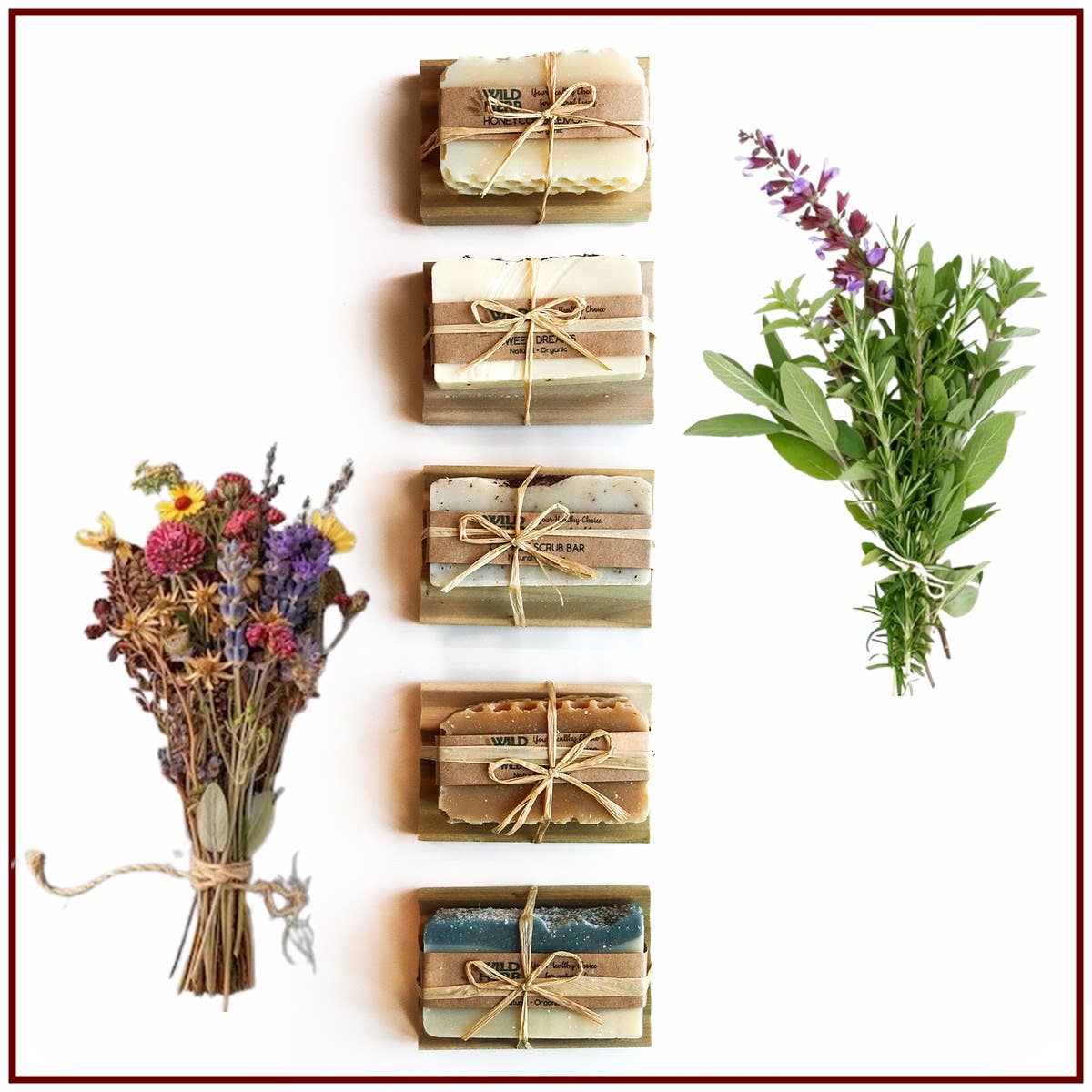 Handcrafted & hand tied. Wild Herb's natural soap bar tied with raffia to handcrafted wood soap dish (made in USA!) for zero waste. Perfect grab for a customer to give as gift to dog and house sitter, co-worker, neighbor friend and family. Highlights of this bar: • Unique soap bar formula: for all ages and all skin types • Zero waste and eco-friendly