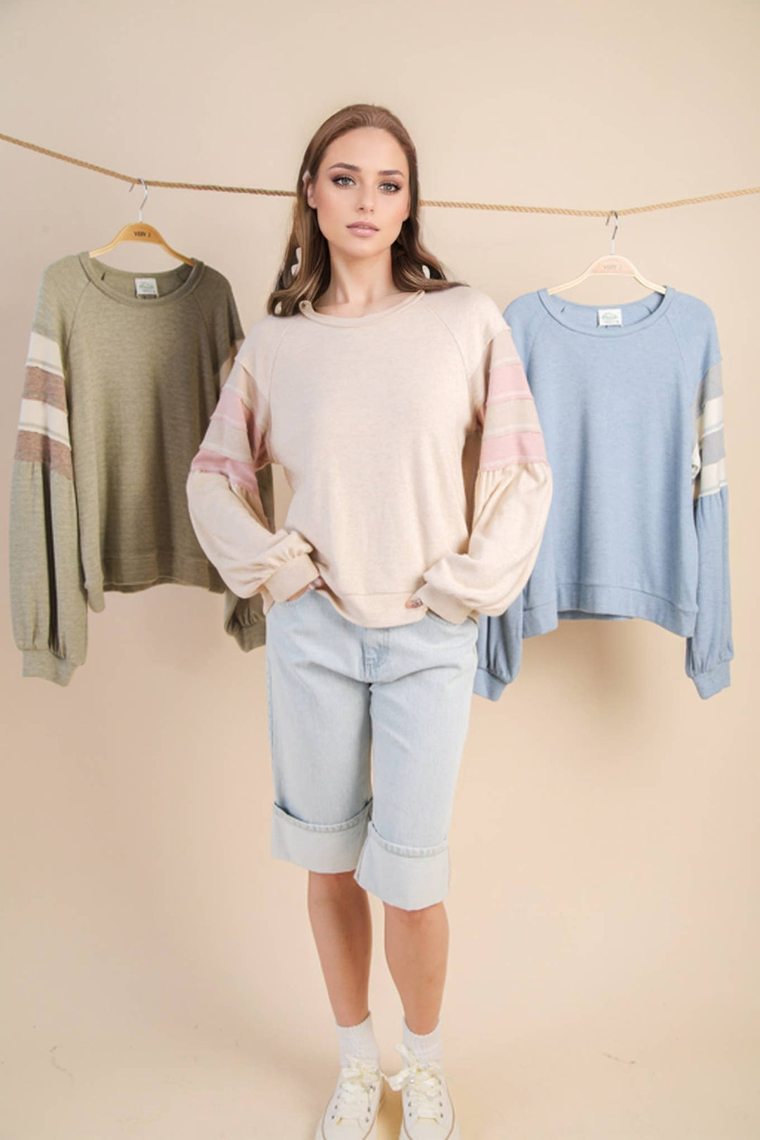 NT11927-Stripe Comfy Casual Oversized Knit Top: DENIM/CREAM / S-M-L/2-2-2