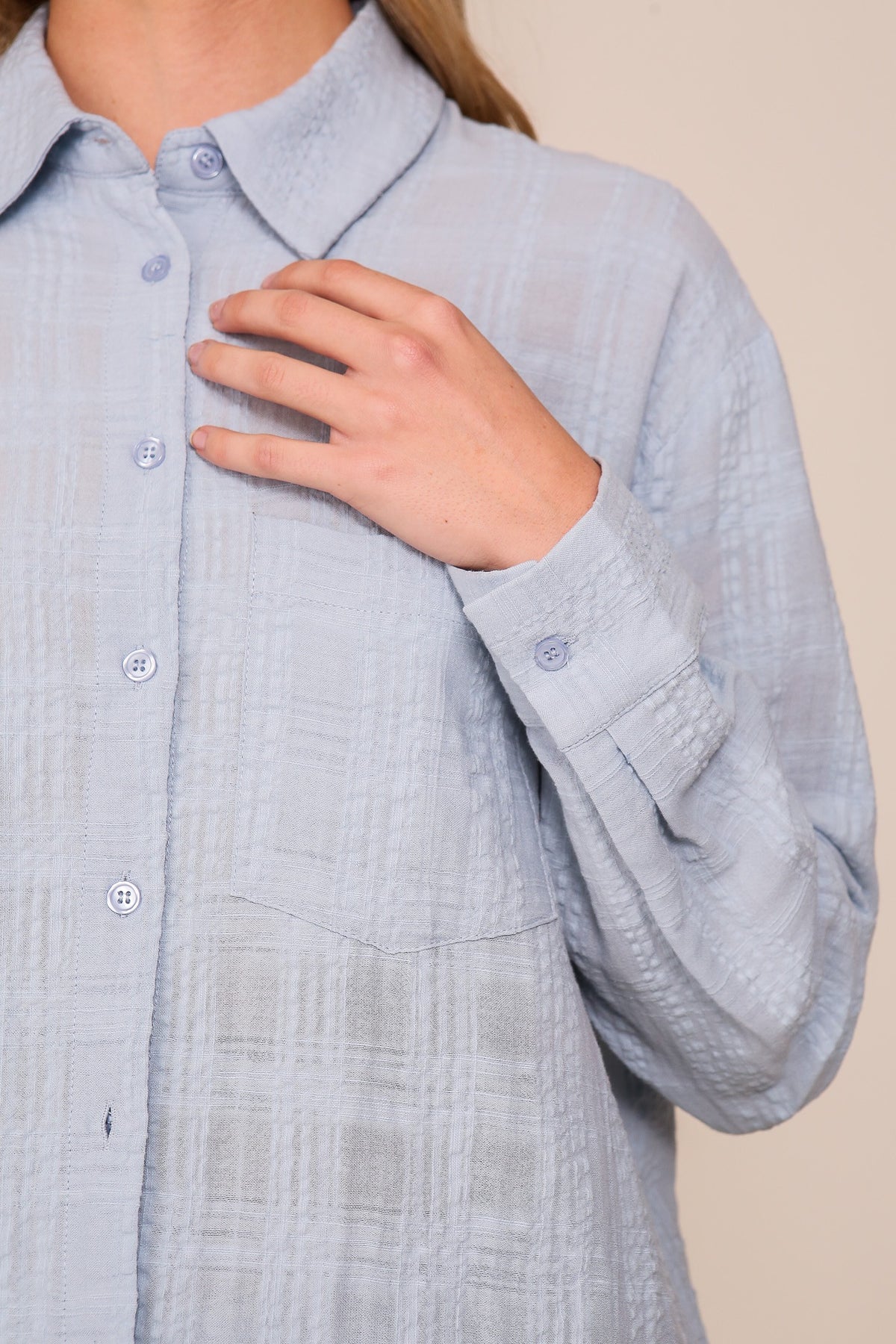 Clean, polished, and effortlessly versatile, this textured button down shirt is a timeless wardrobe essential. The subtle woven texture adds depth while the relaxed silhouette keeps it easy and wearable. Featuring a classic collar and chest pocket detail, this women’s long sleeve blouse transitions seamlessly from office to weekend. Style it tucked, layered, or worn loose for a modern everyday look.