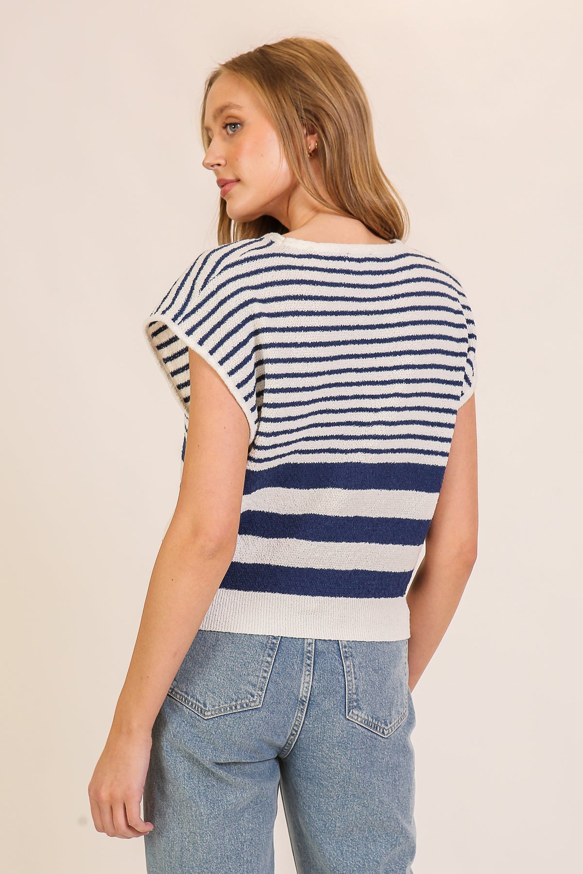Fresh and effortlessly classic, this striped knit top brings timeless coastal charm to your wardrobe. The cap sleeve silhouette and relaxed fit create an easy, flattering shape while the bold stripe contrast adds modern appeal. Designed to pair perfectly with denim or tailored trousers, this women’s striped sweater top transitions seamlessly from casual days to polished outings. A versatile staple you’ll reach for season after season.